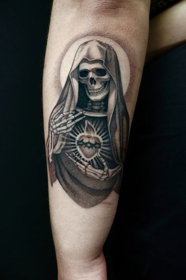 A detailed tattoo of a crowned skeleton holding a pomegranate and crescent moon.