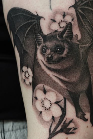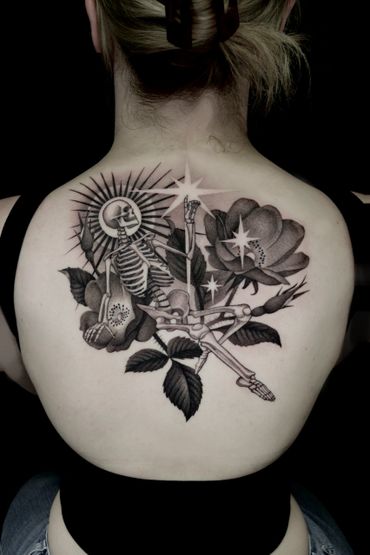 Black and white tattoo of a skeleton with floral and gothic elements.