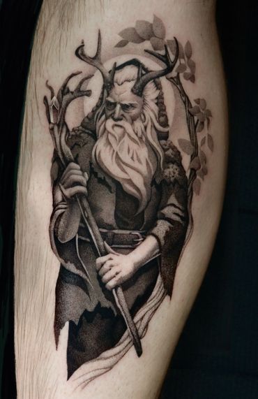 Tattoo of a woman warrior with flowing hair and a sword in black and gray.