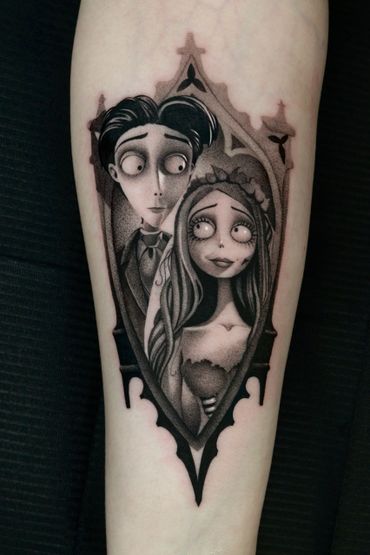 Black and white tattoo of a skeleton embracing a woman with flowers.