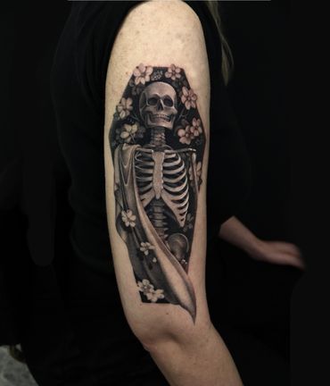 Black and grey tattoo of a skeleton surrounded by flowers on an upper arm.